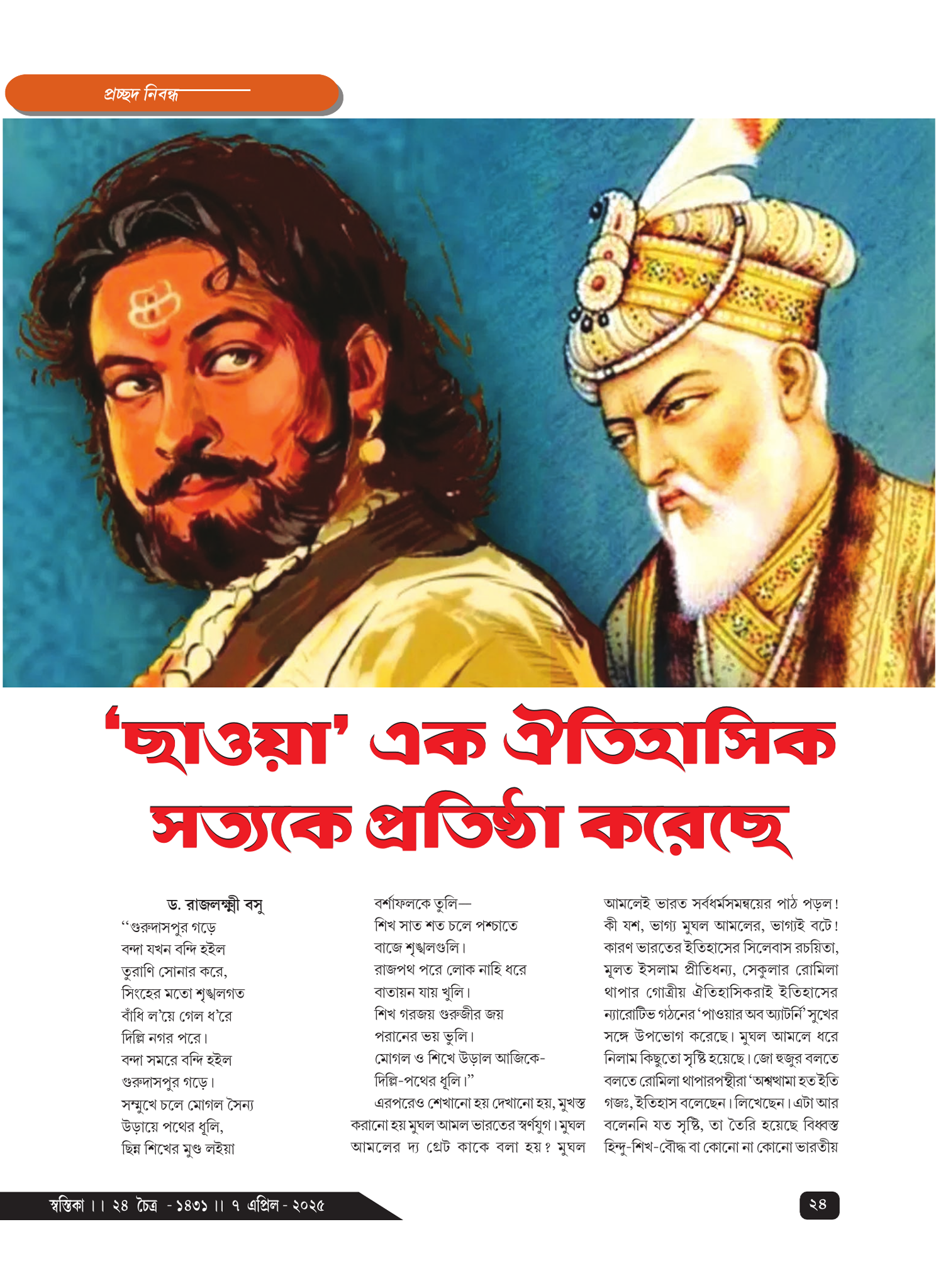 ঔরঙ্গজেবের ইতিহাস নিষিদ্ধ নিষ্ঠুরতার। হিটলার ওর কাছে সত্যিই ছেলেমানুষ। সেকুলার ন্যারেটিভে তিনি ছিলেন Whitewashing Tyrant! এবার ক্ষান্ত হোক সে ন্যারেটিভ। ছাওয়া দেখে ইতিহাস শেখা যাবে? -সেকুলারদের বাঁধা প্রশ্ন। উত্তর হলো- শেখা যাবে না। সিনেমার কাজ ইতিহাস শেখানো কেন হবে! তার জন্য পত্র-পত্রিকা, পুস্তক, প্রবন্ধ, গবেষণাপত্র, চর্চাকেন্দ্র সব আছে। সেসব থেকে শিখে ইতিহাস উদ্ধার করে ‘ছাওয়া’ তৈরি। ছাওয়া-ভুল ইতিহাসটাকে লালকালিতে কাটল কেবল। সেকুলারদের পশমের টিয়া যে রচনানৈপুণ্য দেখাত তার আসল সত্য অগোচর ছিল। ‘ছাওয়া’ তা গোচরে আনল। তা অনেকের গায়ে লাগছে। লাগুক। জাতীয় কর্তব্য প্রতিষ্ঠাতে কোনো আপোশ হতে পারে না।