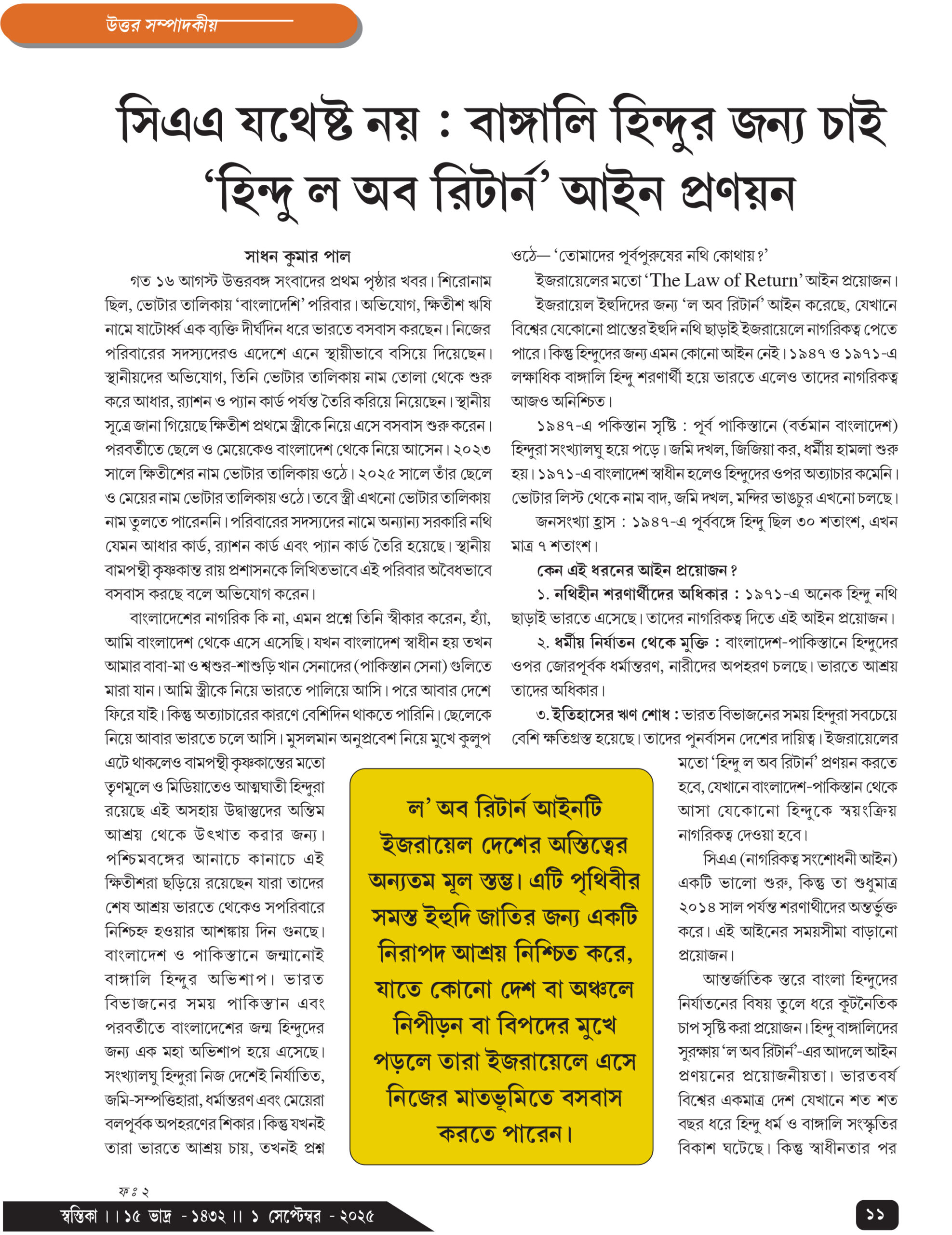 ইজরায়েলের মতো “The Law of Retur’আইন প্রয়োজন। ইজরায়েল ইছদিদের জন্য ‘ল অব রিটার্ন’আইন করেছে, যেখানে বিশ্বের যেকোনো প্রান্তের ইহুদি নথি ছাড়াই ইজরায়েলে নাগরিকত্ব পেতে পারে। কিন্তু হিন্দুদের জন্য এমন কোনো আইন নেই। ১৯৪৭ ও ১৯৭১-এ লক্ষাধিক বাঙ্গালি হিন্দুশরণার্থী হয়ে ভারতে এলেও তাদের নাগরিকত্ব আজও অনিশ্চিত।
