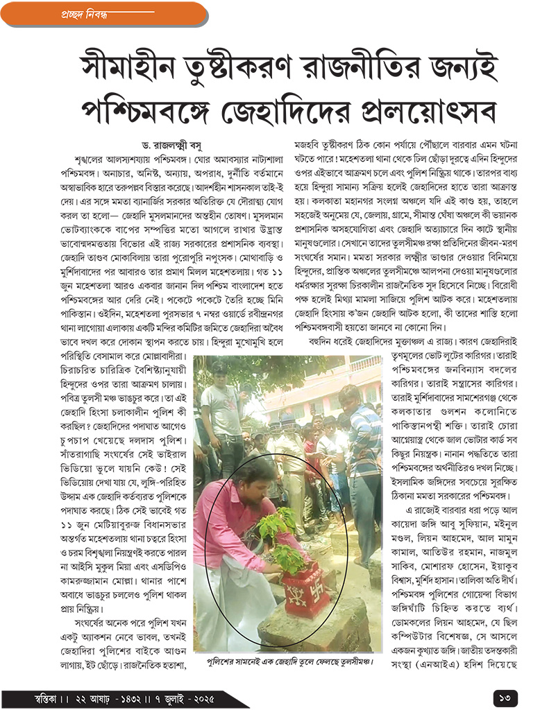 গৈরিক ধ্বজ খুলতে বাধ্য করা হলো। কখনো দুর্গাপ্রতিমা নিরঞ্জনে বাধা, কখনো শ্রীরামনবমীতে প্রশাসনিক নিষেধাজ্ঞা, কখনো তুলসী মঞ্চ ভেঙে গুঁড়িয়ে দেওয়া, কখনো কলকাতার বুকে পুলিশ পাহারায় সরস্বতী পূজা— কোনোটাই আর এই রাজ্যের বিচ্ছিন্ন ঘটনা নয়। জেহাদিদের দুষ্কর্ম এই রাজ্যে অতি সাধারণ ঘটনা। পশ্চিমবঙ্গের বাদুড়িয়া, দত্তপুকুর, বসিরহাট, স্বরূপনগর, মোথাবাড়ি, মুর্শিদাবাদে জেহাদি তাণ্ডব এবং তারপরে এই রাজ্যকে ‘মিনি পাকিস্তান’ আখ্যা দেওয়া মন্ত্রী ফিরহাদ হাকিম যখন দক্ষিণেশ্বর স্কাইওয়াক প্রকল্পের এবং তারকেশ্বর ডেভেলপমেন্ট বোর্ডের চেয়ারম্যান হন-তখন বুঝতে অপেক্ষা থাকে না যে, এ রাজ্যকে বৃহত্তর বাংলাদেশ তৈরির চক্রান্ত চলছে।