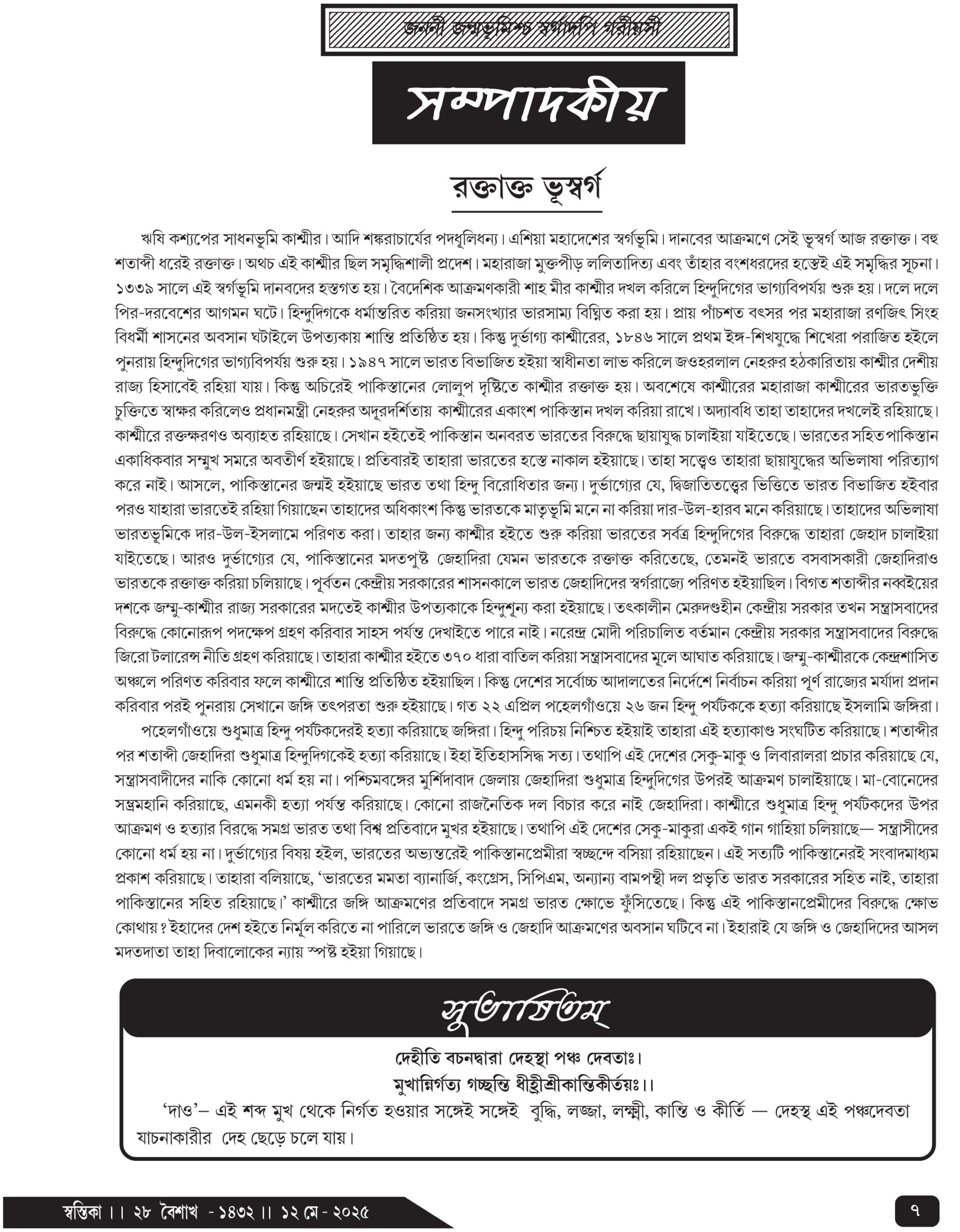 ঋষি কশ্যপের সাধনভূমি কাশ্মীর। আদি শঙ্করাচার্যের পদধূলিধন্য। এশিয়া মহাদেশের স্বর্গভূমি। দানবের আক্রমণে সেই ভূস্বর্গ আজ রক্তাক্ত। বহু শতাব্দী ধরেই রক্তাক্ত। অথচ এই কাশ্মীর ছিল সমৃদ্ধিশালী প্রদেশ। মহারাজা মুক্তপীড় ললিতাদিত্য এবং তাঁহার বংশধরদের হস্তেই এই সমৃদ্ধির সূচনা। ১৩৩৯ সালে এই স্বর্গভূমি দানবদের হস্তগত হয়। বৈদেশিক আক্রমণকারী শাহ মীর কাশ্মীর দখল করিলে হিন্দুদিগের ভাগ্যবিপর্যয় শুরু হয়। দলে দলে পির-দরবেশের আগমন ঘটে। হিন্দুদিগকে ধর্মান্তরিত করিয়া জনসংখ্যার ভারসাম্য বিঘ্নিত করা হয়। প্রায় পাঁচশত বৎসর পর মহারাজা রণজিৎ সিংহ বিধর্মী শাসনের অবসান ঘটাইলে উপত্যকায় শান্তি প্রতিষ্ঠিত হয়। কিন্তু দুর্ভাগ্য কাশ্মীরের, ১৮৪৬ সালে প্রথম ইঙ্গ-শিখযুদ্ধে শিখেরা পরাজিত হইলে পুনরায় হিন্দুদিগের ভাগ্যবিপর্যয় শুরু হয়। ১৯৪৭ সালে ভারত বিভাজিত হইয়া স্বাধীনতা লাভ করিলে জওহরলাল নেহরুর হঠকারিতায় কাশ্মীর দেশীয় রাজ্য হিসাবেই রহিয়া যায়। কিন্তু অচিরেই পাকিস্তানের লোলুপ দৃষ্টিতে কাশ্মীর রক্তাক্ত হয়। অবশেষে কাশ্মীরের মহারাজা কাশ্মীরের ভারতভুক্তি চুক্তিতে স্বাক্ষর করিলেও প্রধানমন্ত্রী নেহরুর অদূরদর্শিতায় কাশ্মীরের একাংশ পাকিস্তান দখল করিয়া রাখে। অদ্যাবধি তাহা তাহাদের দখলেই রহিয়াছে। কাশ্মীরে রক্তক্ষরণও অব্যাহত রহিয়াছে। সেখান হইতেই পাকিস্তান অনবরত ভারতের বিরুদ্ধে ছায়াযুদ্ধ চালাইয়া যাইতেছে। ভারতের সহিত পাকিস্তান একাধিকবার সম্মুখ সমরে অবতীর্ণ হইয়াছে। প্রতিবারই তাহারা ভারতের হস্তে নাকাল হইয়াছে। তাহা সত্ত্বেও তাহারা ছায়াযুদ্ধের অভিলাষা পরিত্যাগ করে নাই। আসলে, পাকিস্তানের জন্মই হইয়াছে ভারত তথা হিন্দু বিরোধিতার জন্য। দুর্ভাগ্যের যে, দ্বিজাতিতত্ত্বের ভিত্তিতে ভারত বিভাজিত হইবার পরও যাহারা ভারতেই রহিয়া গিয়াছেন তাহাদের অধিকাংশ কিন্তু ভারতকে মাতৃভূমি মনে না করিয়া দার-উল-হারব মনে করিয়াছে। তাহাদের অভিলাষা ভারতভূমিকে দার-উল-ইসলামে পরিণত করা। তাহার জন্য কাশ্মীর হইতে শুরু করিয়া ভারতের সর্বত্র হিন্দুদিগের বিরুদ্ধে তাহারা জেহাদ চালাইয়া যাইতেছে। আরও দুর্ভাগ্যের যে, পাকিস্তানের মদতপুষ্ট জেহাদিরা যেমন ভারতকে রক্তাক্ত করিতেছে, তেমনই ভারতে বসবাসকারী জেহাদিরাও ভারতকে রক্তাক্ত করিয়া চলিয়াছে। পূর্বতন কেন্দ্রীয় সরকারের শাসনকালে ভারত জেহাদিদের স্বর্গরাজ্যে পরিণত হইয়াছিল। বিগত শতাব্দীর নব্বইয়ের দশকে জম্মু-কাশ্মীর রাজ্য সরকারের মদতেই কাশ্মীর উপত্যকাকে হিন্দুশূন্য করা হইয়াছে। তৎকালীন মেরুদণ্ডহীন কেন্দ্রীয় সরকার তখন সন্ত্রাসবাদের বিরুদ্ধে কোনোরূপ পদক্ষেপ গ্রহণ করিবার সাহস পর্যন্ত দেখাইতে 