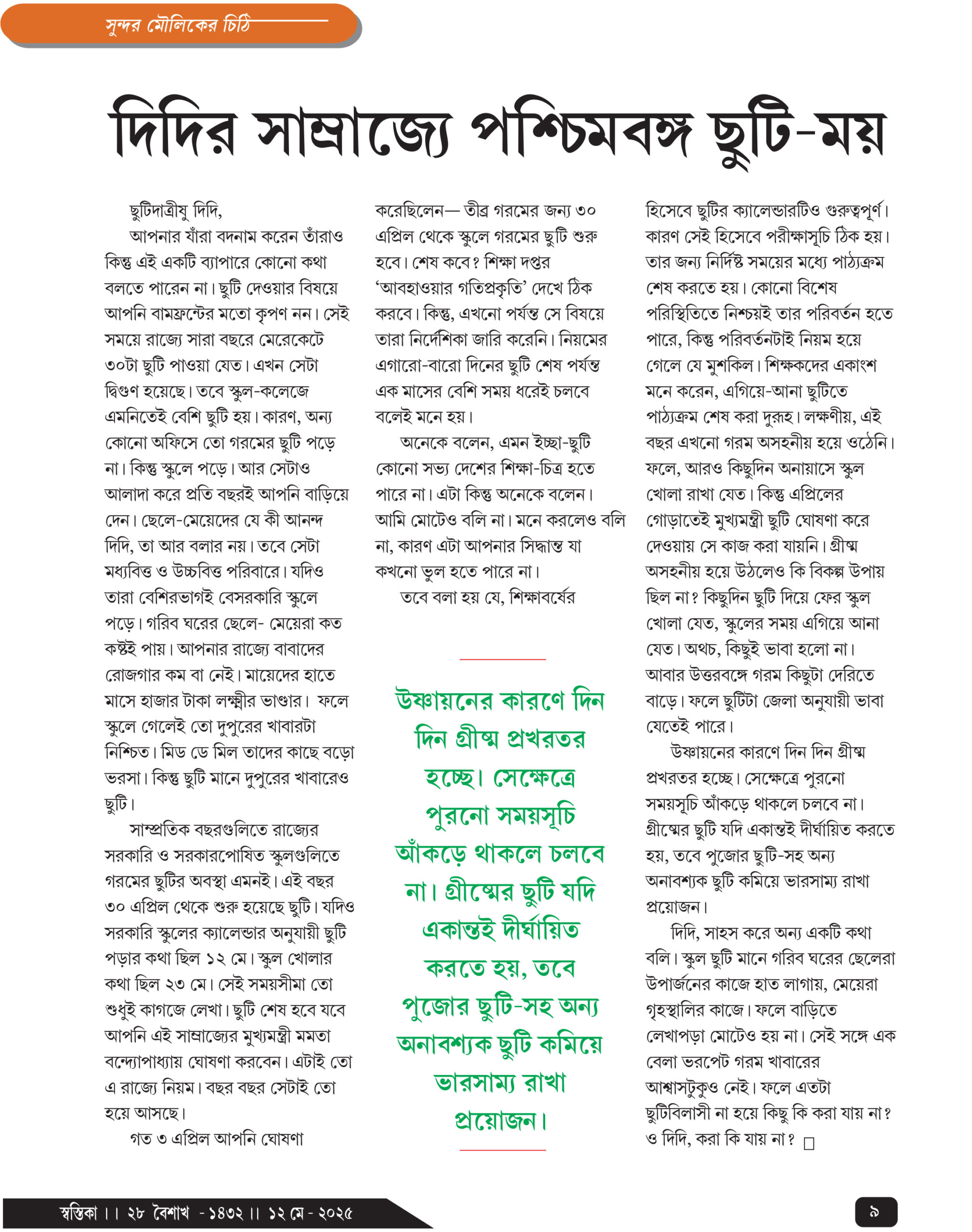 আপনার যাঁরা বদনাম করেন তাঁরাও কিন্তু এই একটি ব্যাপারে কোনো কথা বলতে পারেন না। ছুটি দেওয়ার বিষয়ে আপনি বামফ্রন্টের মতো কৃপণ নন। সেই সময়ে রাজ্যে সারা বছরে মেরেকেটে ৩০টা ছুটি পাওয়া যেত। এখন সেটা দ্বিগুণ হয়েছে। তবে স্কুল-কলেজে এমনিতেই বেশি ছুটি হয়। কারণ, অন্য কোনো অফিসে তো গরমের ছুটি পড়ে না। কিন্তু স্কুলে পড়ে। আর সেটাও আলাদা করে প্রতি বছরই আপনি বাড়িয়ে দেন। ছেলে-মেয়েদের যে কী আনন্দ দিদি, তা আর বলার নয়। তবে সেটা মধ্যবিত্ত ও উচ্চবিত্ত পরিবারে। যদিও তারা বেশিরভাগই বেসরকারি স্কুলে পড়ে। গরিব ঘরের ছেলে- মেয়েরা কত কষ্টই পায়। আপনার রাজ্যে বাবাদের রোজগার কম বা নেই। মায়েদের হাতে মাসে হাজার টাকা লক্ষ্মীর ভাণ্ডার। ফলে স্কুলে গেলেই তো দুপুরের খাবারটা নিশ্চিত। মিড ডে মিল তাদের কাছে বড়ো ভরসা। কিন্তু ছুটি মানে দুপুরের খাবারেও ছুটি।