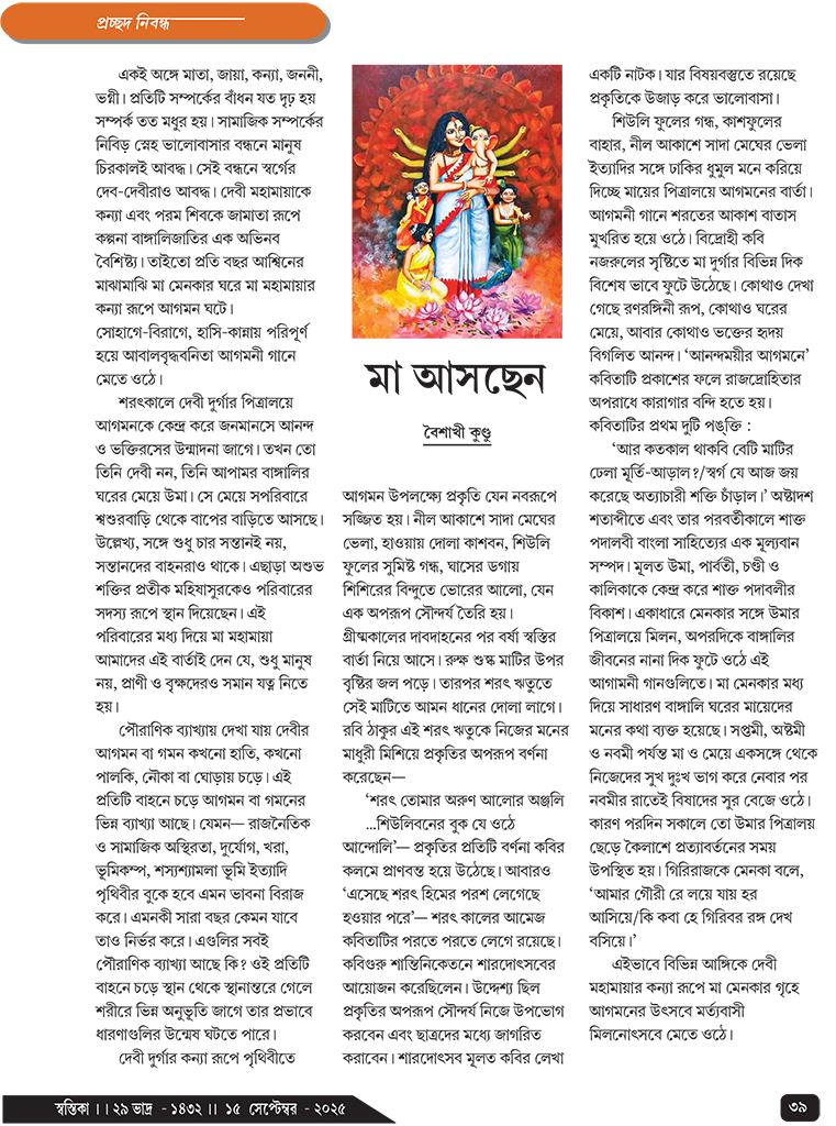 একই অঙ্গে মাতা, জায়া, কন্যা, জননী, ভগ্নী। প্রতিটি সম্পর্কের বাঁধন যত দৃঢ় হয় সম্পর্ক তত মধুর হয়। সামাজিক সম্পর্কের নিবিড় স্নেহ ভালোবাসার বন্ধনে মানুষ চিরকালই আবদ্ধ। সেই বন্ধনে স্বর্গের দেব-দেবীরাও আবদ্ধ। দেবী মহামায়াকে কন্যা এবং পরম শিবকে জামাতা রূপে কল্পনা বাঙ্গালিজাতির এক অভিনব বৈশিষ্ট্য। তাইতো প্রতি বছর আশ্বিনের মাঝামাঝি মা মেনকার ঘরে মা মহামায়ার কন্যা রূপে আগমন ঘটে। সোহাগে-বিরাগে, হাসি-কান্নায় পরিপূর্ণ