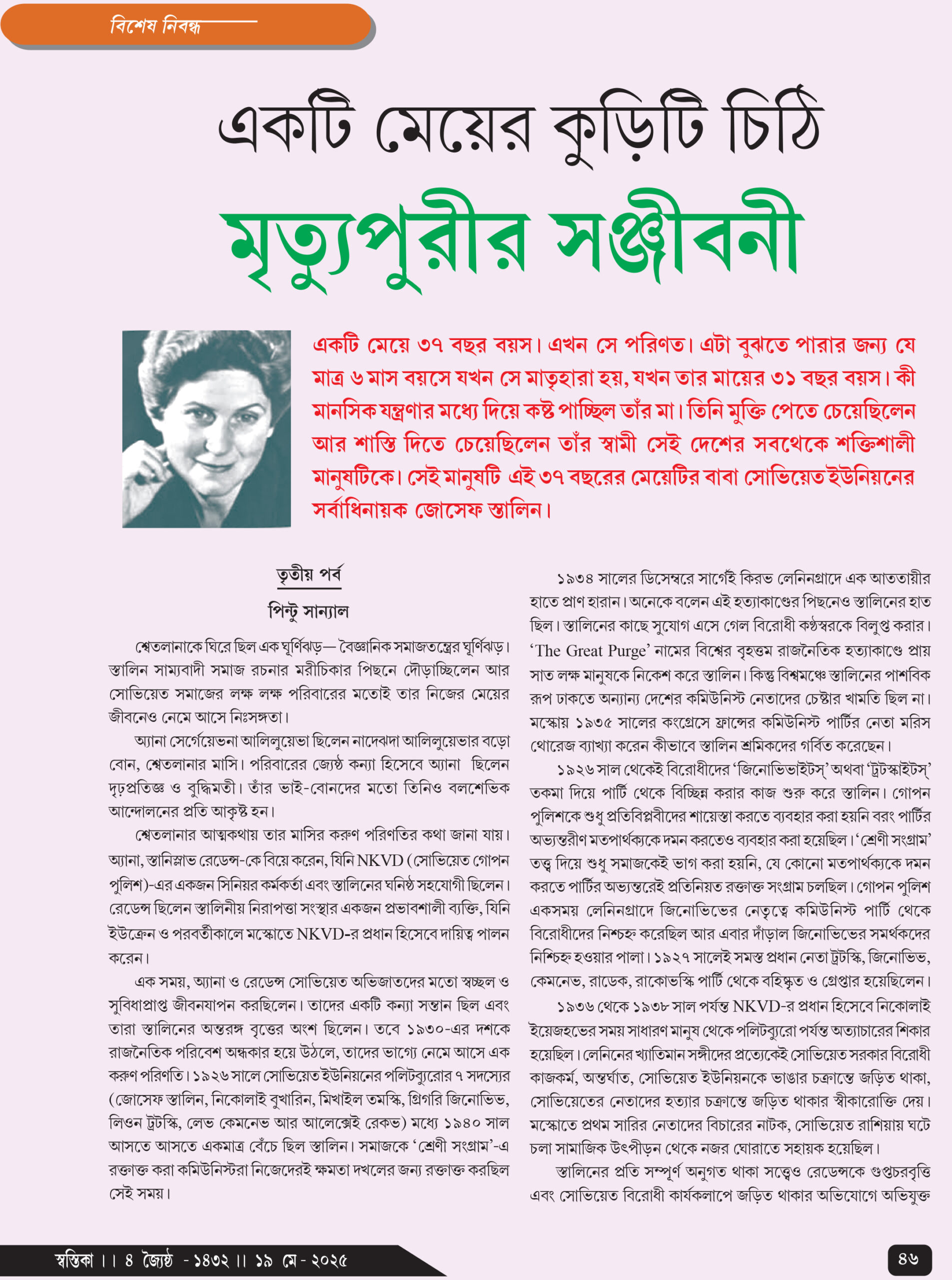 একটি মেয়ে ৩৭ বছর বয়স। এখন সে পরিণত। এটা বুঝতে পারার জন্য যে মাত্র ৬ মাস বয়সে যখন সে মাতৃহারা হয়, যখন তার মায়ের ৩১ বছর বয়স। কী মানসিক যন্ত্রণার মধ্যে দিয়ে কষ্ট পাচ্ছিল তাঁর মা। তিনি মুক্তি পেতে চেয়েছিলেন আর শাস্তি দিতে চেয়েছিলেন তাঁর স্বামী সেই দেশের সবথেকে শক্তিশালী মানুষটিকে। সেই মানুষটি এই ৩৭ বছরের মেয়েটির বাবা সোভিয়েত ইউনিয়নের সর্বাধিনায়ক জোসেফ স্তালিন।