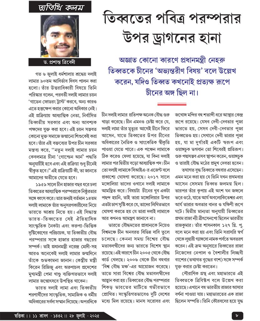১৯৫৯ সালে চীন হাজার বছর ধরে চলা তিব্বতের আধ্যাত্মিক পরম্পরাকে নিষ্ঠুরতার সঙ্গে ধ্বংস করে। তার জন্যই বর্তমান ১৪তম দলাই লামাকে তাঁর অনুসরণকারীদের নিয়ে ভারতে আশ্রয় নিতে হয়। এই সিদ্ধান্ত ভারত-তিব্বতের সেই ঐতিহাসিক সাংস্কৃতিক নৈকট্য এবং করুণা-ভিত্তিক দৃষ্টিকোণের পরিচায়ক, যা তিব্বতীয় বৌদ্ধ পরম্পরার সঙ্গে হাজার হাজার বছরের সম্পর্ক। তাই প্রধানমন্ত্রী নরেন্দ্র মোদী-সহ আরও অনেকেই দলাই লামার জন্মদিনে তাঁকে শুভকামনা জানান। কেন্দ্রীয় মন্ত্রী কিরেন রিজিজু এবং অরুণাচল প্রদেশের মুখ্যমন্ত্রী পেমা খাণ্ডু ব্যক্তিগতভাবে দলাই লামার জন্মোৎসবে উপস্থিত থাকেন।