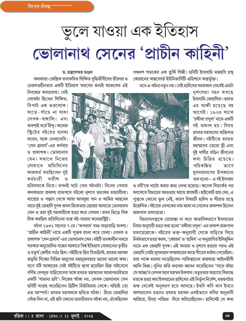 ঘটনা ১৯৩১ সালের ৭ মে। ‘অপরাধ’ বড্ড বাড়াবাড়ি অবশ্য। ‘প্রাচীন কাহিনী’ নামে একটি পুস্তক রচনা করে ফেলা। লেখক ও প্রকাশক ‘সেন ব্রাদার্স’-এর ভোলানাথ সেন। বইটি তৎকালীন সময়ে সরকার অনুমোদিত গল্পের আকারে বিশ্ব ইতিহাস বোঝানোর তৃতীয় ও চতুর্থ শ্রেণীর পাঠ্য ছিল। বইটিতে ছিল যিশুখ্রিস্ট, হযরত মহম্মদ প্রভৃতি বিশ্বের বিভিন্ন মানুষের মহানুভবতার ভালো ভালো কথা। তবে চটি আকারের সেই বইটিতে ছাপা হয়েছিল হিব্রু বাইবেলে বর্ণিত দেবদূত গাব্রিয়েলের সঙ্গে হযরত মহম্মদের আলাপচারিতার একটি ‘সামান্য ছবি’। নিজের আঁকা নয়, লেখক ভোলানাথ সেন ছবিটি সংগ্রহ করেছিলেন ব্রিটিশ মিউজিয়াম থেকে। সত্যিই তো এত আস্পর্ধা! হযরত মহম্মদকে ছবিতে আঁকা! হিংস্র জেহাদিরা খোঁজ নিল না, এই ছবি কোনো ভারতীয়রও আঁকা নয়, এঁকেছিলেন পঞ্চদশ শতকের এক তুর্কি শিল্পী। ছবিটি ইসলামি মজহবি গ্রন্থ কোরানের অক্সফোর্ড ইউনিভার্সিটি এডিশনে অন্তর্ভুক্ত।