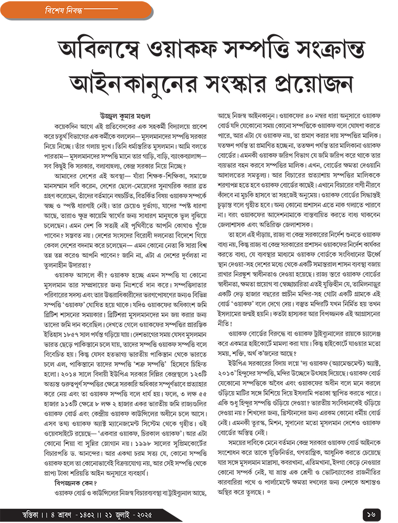 অবিলম্বে ওয়াকফ সম্পত্তি সংক্রান্ত আইনকানুনের সংস্কার প্রয়োজন