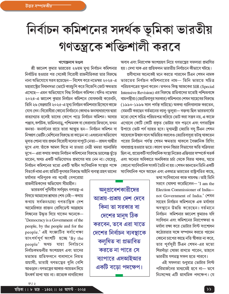 জাতির সামনে বর্তমানে একটি গভীর সংকট এসে উপস্থিত হয়েছে। বেআইনি অনুপ্রবেশকারীদের প্রভাবে শুধুমাত্র সীমান্ত রাজ্যগুলিই নয়, ভারতের সবকটি মেট্রো শহরে বাংলাদেশি বে-আইনি অনুপ্রবেশকারী এবং বাংলাদেশ হয়ে ভারতে আসা লক্ষ লক্ষ রোহিঙ্গারা শুধু জন-ভারসাম্য পালটে দিচ্ছে তা নয়– আইন-শৃঙ্খলাজনিত সমস্যা, এমনকী দেশের অখণ্ডতা রক্ষার ক্ষেত্রেও বিপজ্জনক হয়ে উঠেছে। অনুপ্রবেশকারীদের আশ্রয়-প্রশ্রয় দেশ দেবে কিনা তা সরকার বা দেশের মানুষ ঠিক করবেন, তবে এরা যাতে দেশের নির্বাচন ব্যবস্থাকে কলুষিত বা প্রভাবিত করতে না পারে সে ব্যাপারে এসআইআর একটি বড়ো পদক্ষেপ। নির্বাচন কমিশন কোনো হুমকি বা প্রতিবাদে প্রভাবিত না হয়ে নিজেদের কর্তব্যে স্থির থাকবেন এটাই প্রত্যাশা, অন্যথায় গণতন্ত্র ভূলুণ্ঠিত