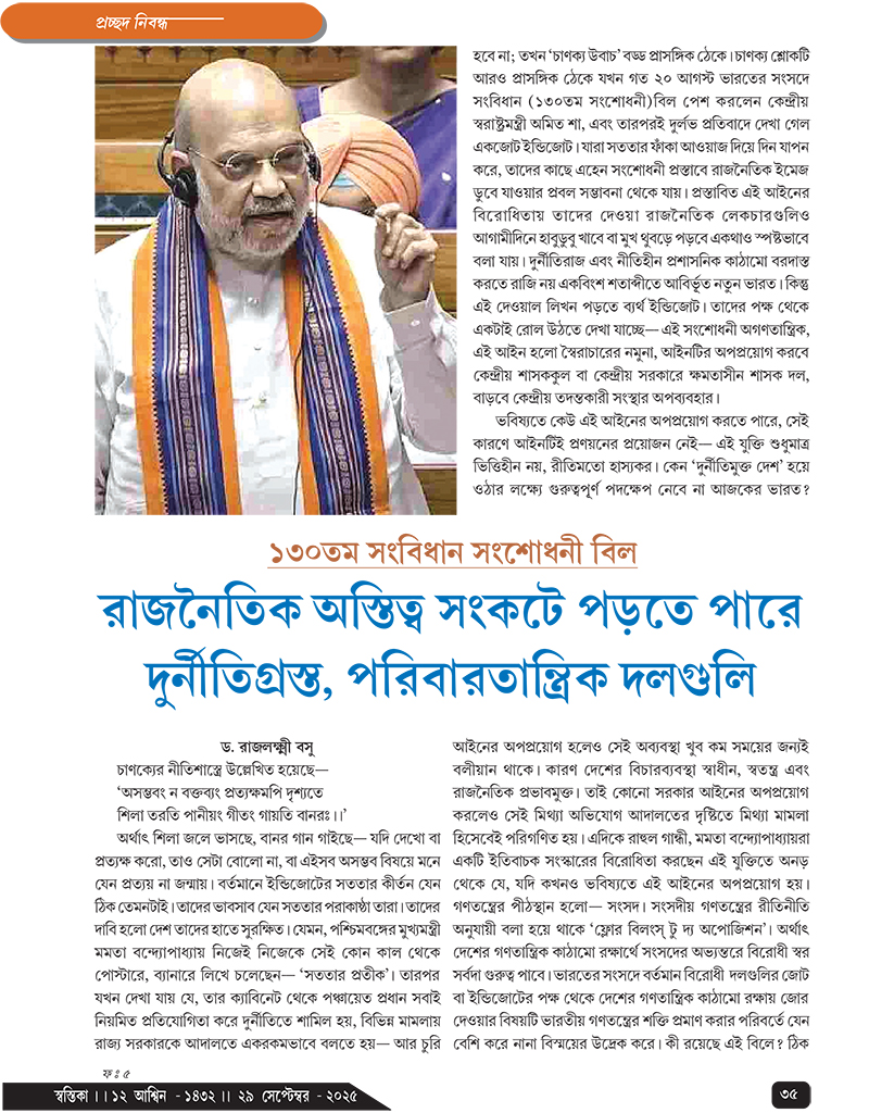 হবে না; তখন ‘চাণক্য উবাচ’ বড্ড প্রাসঙ্গিক ঠেকে। চাণক্য শ্লোকটি আরও প্রাসঙ্গিক ঠেকে যখন গত ২০ আগস্ট ভারতের সংসদে সংবিধান (১৩০তম সংশোধনী) বিল পেশ করলেন কেন্দ্রীয় স্বরাষ্ট্রমন্ত্রী অমিত শা, এবং তারপরই দুর্লভ প্রতিবাদে দেখা গেল একজোট ইন্ডিজোট। যারা সততার ফাঁকা আওয়াজ দিয়ে দিন যাপন করে, তাদের কাছে এহেন সংশোধনী প্রস্তাবে রাজনৈতিক ইমেজ ডুবে যাওয়ার প্রবল সম্ভাবনা থেকে যায়। প্রস্তাবিত এই আইনের বিরোধিতায় তাদের দেওয়া রাজনৈতিক লেকচারগুলিও আগামীদিনে হাবুডুবু খাবে বা মুখ থুবড়ে পড়বে একথাও স্পষ্টভাবে বলা যায়। দুর্নীতিরাজ এবং নীতিহীন প্রশাসনিক কাঠামো বরদাস্ত করতে রাজি নয় একবিংশ শতাব্দীতে আবির্ভূত নতুন ভারত। কিন্তু এই দেওয়াল লিখন পড়তে ব্যর্থ ইন্ডিজোট। তাদের পক্ষ থেকে একটাই রোল উঠতে দেখা যাচ্ছে- এই সংশোধনী অগণতান্ত্রিক, এই আইন হলো স্বৈরাচারের নমুনা, আইনটির অপপ্রয়োগ করবে কেন্দ্রীয় শাসককুল বা কেন্দ্রীয় সরকারে ক্ষমতাসীন শাসক দল, বাড়বে কেন্দ্রীয় তদন্তকারী সংস্থার অপব্যবহার।