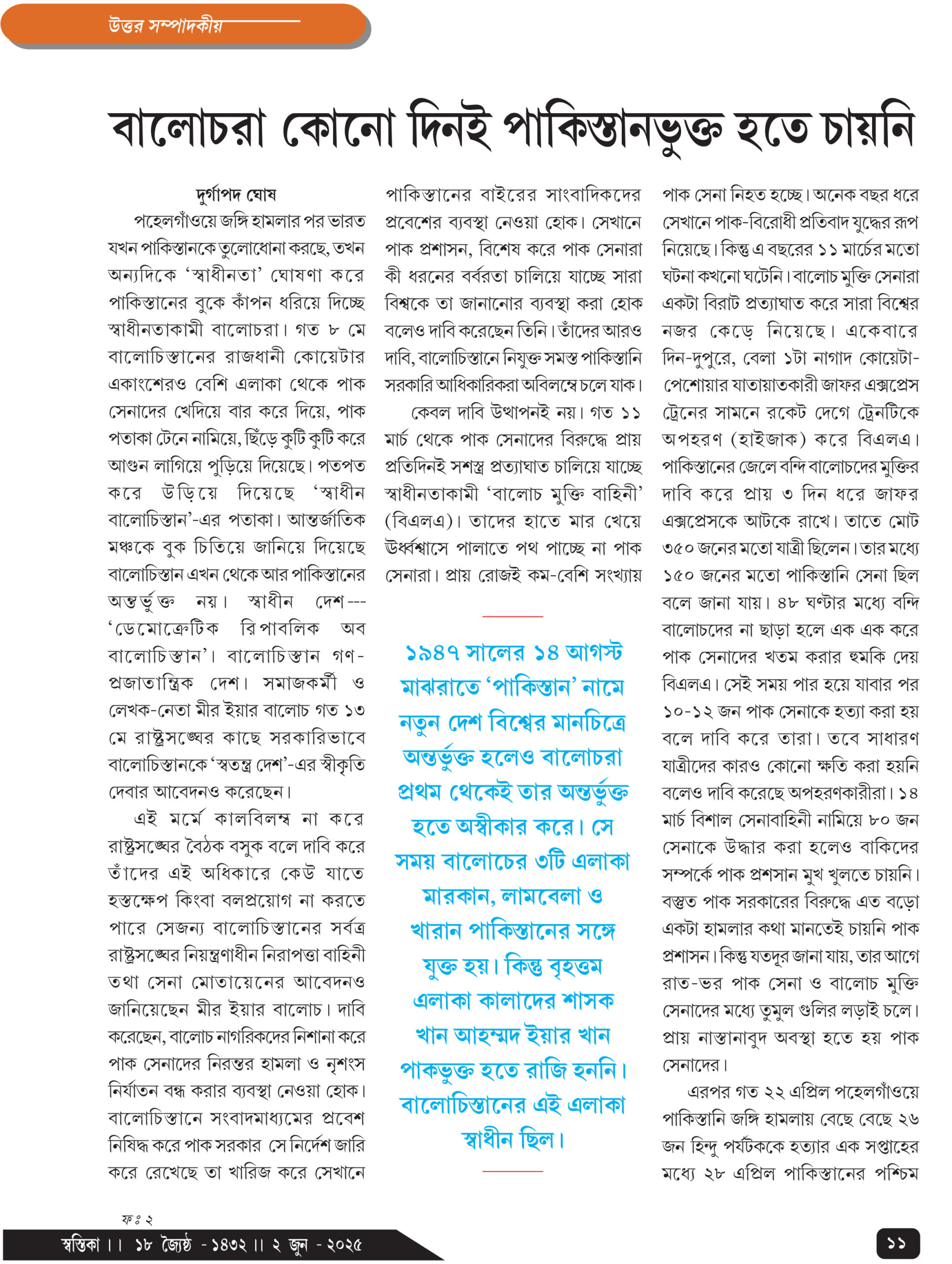 এদিকে ২০১৯ সালে পুলওয়ামায় ভারতীয় সেনা ঘাঁটিতে এবং এ বছরের ২২ এপ্রিল পহেলগাঁওয়ে সন্ত্রাসী হামলার পর নরেন্দ্র মোদীর ভারত যখন বালাকোটে এবং পাকিস্তানের বিভিন্ন জায়গায় যথাক্রমে ‘সার্জিক্যাল স্ট্রাইক’ এবং ‘অপারেশন সিঁদুর’-এর মাধ্যমে পাকিস্তানকে নাস্তানাবুদ করে দিয়েছিল, বালোচরাও তখন একের পর এক মোক্ষম আঘাত করে গেছে ‘জঙ্গিদেশ’ পাকিস্তানের বিরুদ্ধে। তাদের লক্ষ্য পাকিস্তানের খপ্পর থেকে বেরিয়ে স্বাধীন হওয়া। এটাই হলো উপযুক্ত সময়। বালোচ নেতারা ভারতকে পুরোপুরি সমর্থন করে বলেছেন, ভারত পাক অধিকৃত কাশ্মীর ফিরিয়ে নেবার জন্য পূর্ব দিক থেকে পাকিস্তানকে আক্রমণ করুক, বালোচরা দক্ষিণ-পশ্চিম দিক থেকে আক্রমণ করে পাকিস্তানকে চিঁড়ে চ্যাপ্টা করে দেবে।