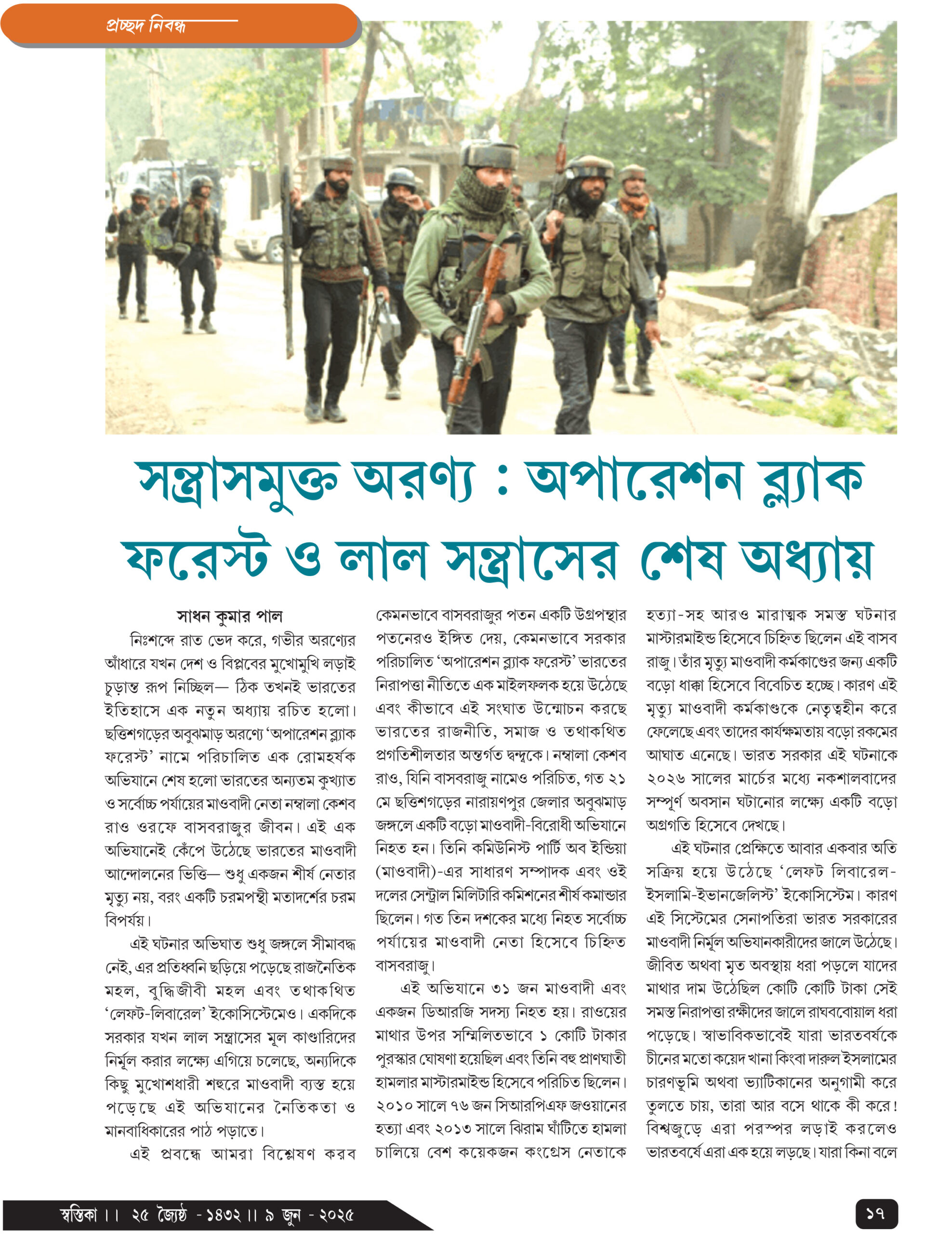 কেমনভাবে বাসবরাজুর পতন একটি উগ্রপন্থার পতনেরও ইঙ্গিত দেয়, কেমনভাবে সরকার পরিচালিত ‘অপারেশন ব্ল্যাক ফরেস্ট’ ভারতের নিরাপত্তা নীতিতে এক মাইলফলক হয়ে উঠেছে এবং কীভাবে এই সংঘাত উন্মোচন করছে ভারতের রাজনীতি, সমাজ ও তথাকথিত প্রগতিশীলতার অন্তর্গত দ্বন্দুকে। নম্বালা কেশব রাও, যিনি বাসবরাজু নামেও পরিচিত, গত ২১ মে ছত্তিশগড়ের নারায়ণপুর জেলার অবুঝমাড় জঙ্গলে একটি বড়ো মাওবাদী-বিরোধী অভিযানে নিহত হন। তিনি কমিউনিস্ট পার্টি অব ইন্ডিয়া (মাওবাদী)-এর সাধারণ সম্পাদক এবং ওই দলের সেন্ট্রাল মিলিটারি কমিশনের শীর্ষ কমান্ডার ছিলেন। গত তিন দশকের মধ্যে নিহত সর্বোচ্চ পর্যায়ের মাওবাদী নেতা হিসেবে চিহ্নিত বাসবরাজু।