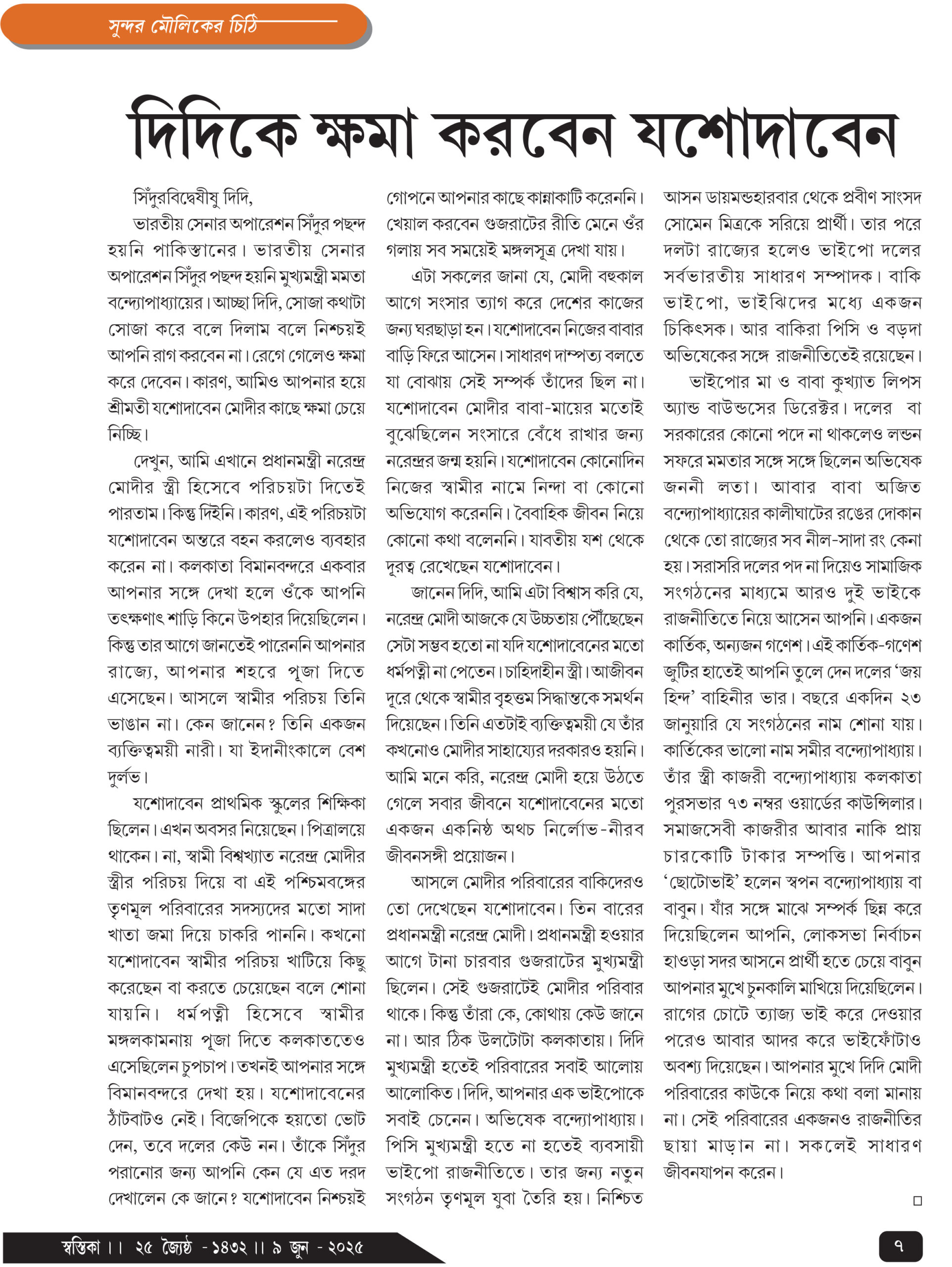 ভারতীয় সেনার অপারেশন সিঁদুর পছন্দ হয়নি পাকিস্তানের। ভারতীয় সেনার অপারেশন সিঁদুর পছন্দ হয়নি মুখ্যমন্ত্রী মমতা বন্দ্যোপাধ্যায়ের। আচ্ছা দিদি, সোজা কথাটা সোজা করে বলে দিলাম বলে নিশ্চয়ই আপনি রাগ করবেন না। রেগে গেলেও ক্ষমা করে দেবেন। কারণ, আমিও আপনার হয়ে শ্রীমতী যশোদাবেন মোদীর কাছে ক্ষমা চেয়ে নিচ্ছি।